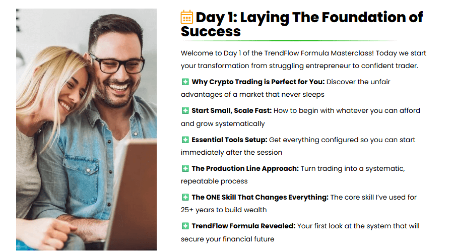 At its core, TrendFlow Formula is a 3-Day Live Masterclass that introduces a proven trading method—refined over 25 years of experience and now enhanced with machine learning. Unlike most trading courses that bury you in complex charts and technical jargon, this one breaks it all down into a simple, actionable three-step system you can follow in just 30 minutes a day.