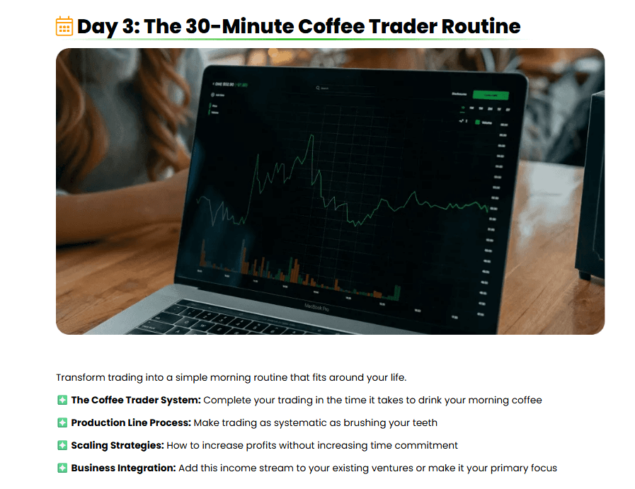 Nicknamed the “Coffee Trader” routine, this approach is designed to fit into even the busiest schedules. You’ll learn how to spot and execute trades in just 30 minutes a day — ideal for side hustlers or anyone short on time.Risk-Free Practice Environment